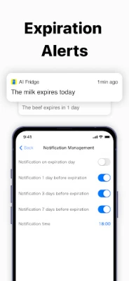 - Expiration Reminders: Get push notifications before food items expire, allowing you to use them in time.