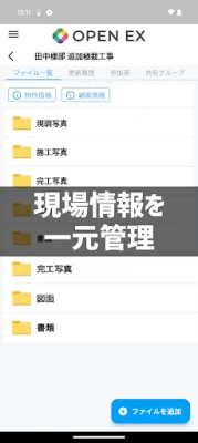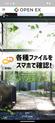 OPEN EX ビューワーとはOPEN EXシステムを通して、エクステリア工事の物件情報や様々なファイルを共有できるアプリです。