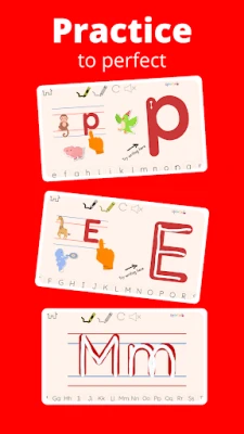 An animation repeatedly plays to show the proper letter and number formation. Children watch the animation and try tracing independently on the big red letter. A stylus or a finger can be used to trace. Tracing with a finger is similar to writing on a sand tray with a finger or on a slate with water. Writing with a stylus is similar to writing with a pencil on paper. So kids start with finger tracing and gradually progress to paper-pencil writing.