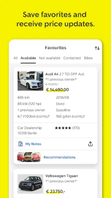 Price drops, latest car offers & changes to bookmarked cars - via push directly from our car app to your mobile phone. Features such as notepad & search favorites will help you to find your car easily.