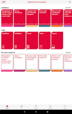 The European Society for Vascular Surgery (ESVS) guidelines app collects together the recently published clinical practice guidelines written by the experts in the field. The guidelines can be found in easily readable form for easy use in everyday practice. The recommendations for diagnosis and treatment of vascular surgical diseases are readily available. The app contains the original text of the guidelines describing also the evidence behind the recommendations. Interactive algorithms, calculators, and scores have been added to assist the user in clinical daily work. The app enables easy navigation, searches within the app, bookmarking the useful pages, and taking notes. Once downloaded, the app can be used offline.