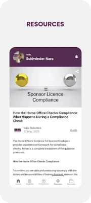 Sponsor Licence Compliance Guru - Sponsor Licence Compliance Checker app by Nara Solicitors to keep your business complaint, Check sponsor licence eligibility, compliance score of your business, Set reminders and receive notifications for your employee's visa expiries and more.
